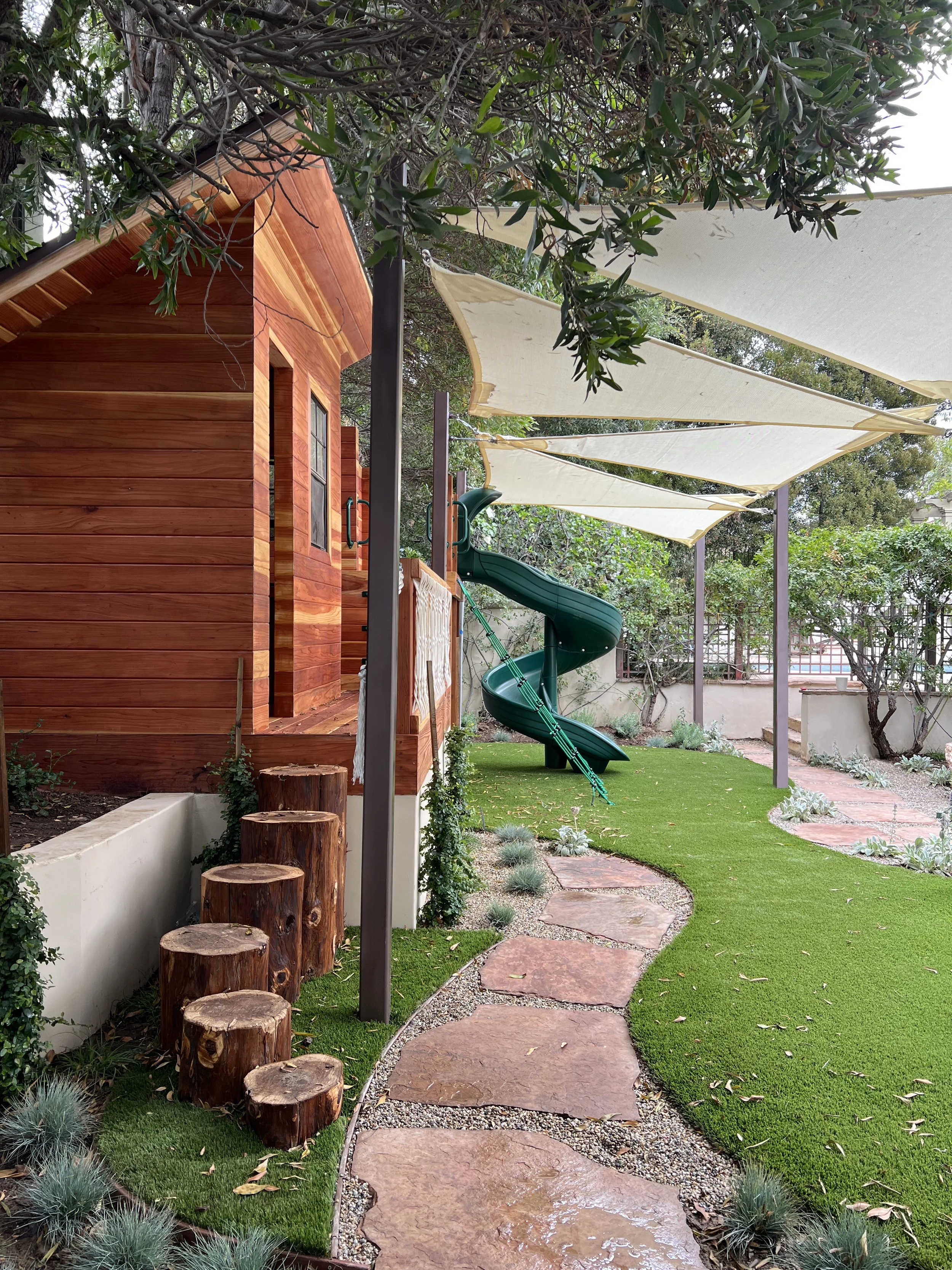 This play garden was commissioned by a lovely pair of grandparents for their first grandchild. The wooden playhouse is tucked away in a raised planter underneath an existing hedge to integrate it as much as possible to the existing landscape. Wood stump steps lead up to the playhouse, which has a braided rope railing. A rung ladder leads to the top deck, where the slide is located. There is also a cargo net for climbing, a rope ladder, and plenty of handles. The spider web swing is hanging from a steel beam attached to steel posts, which also support the shade sail system. The padded artificial turf is soft underfoot where needed, broken up by a flagstone walkway and plenty of soft and fragrant plants. A boulder fountain provides the opportunity for water play and nearby, a little matching bench is underneath the Chinese Elm tree that will provide shade in the future.